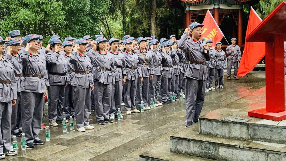 行政后勤科室第一、二党支部的党员们身着红军服高举右手重温入党誓词
