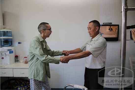 当天下午,在州中心医院骨科病房内,谭海波已经能够站立并借助助行器行走,解决了20多年只能在轮椅上生活的困难,也使他离“站着为留守儿童上课”的梦想更近了一步。