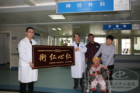 1月12日,在州中心医院神经外科的病区内,6岁男孩肖昌哲在父母的陪同下将写有“仁心仁术”的牌匾送到了该科主任邓民强和主管医生向春晖的手中。尽管小昌哲现在的语言能力还没有完全恢复,但他依旧紧紧拉着陪伴了自己半年的“邓伯伯”和“向叔叔”的手,嘴里“啊啊”的念叨着。小昌哲的妈妈解释,他这是在向自己的“救命恩人”和神经外科所有的医护人员表示感谢。半年来,正是他们一次次把小昌哲从死亡线上拉了回来,才有了如今这个鲜活的生命。
