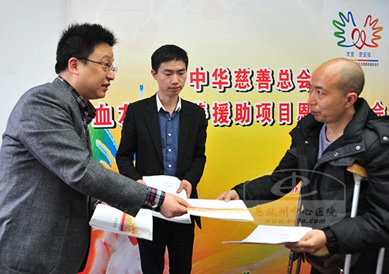 州中心医院副院长吴波(左一)、州慈善总会副秘书长康峰(左二)为血友病患者发放援助申请书及资料