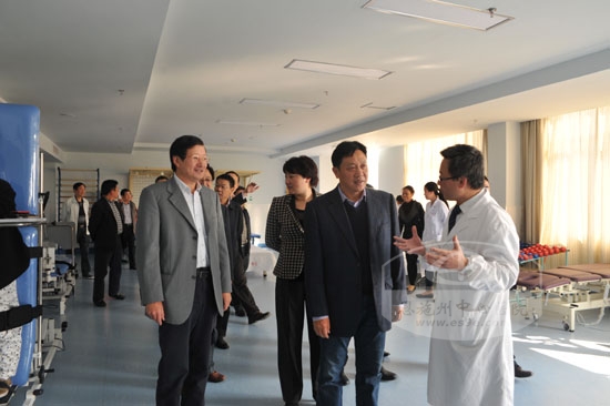 杨天然一行先后来到州民族医院(即州中心医院中医部)、州中心医院新区医疗中心建设工地,了解中医大楼改扩建工程竣工后运行情况,以及新区医疗中心分期建设规划和一期工程建设情况,听取了州中心医院院长李拓的详细汇报。在刚刚搬迁到中医大楼新建附楼的康复医学科,杨天然一行查看了该科传统康复治疗室和现代物理运动治疗室,对该院将祖国传统医学与现代康复医学有机结合,以及充满民族文化气息的室内布局给予了充分肯定,要求该院为州内外各族群众提供更加优质的医疗保健服务。